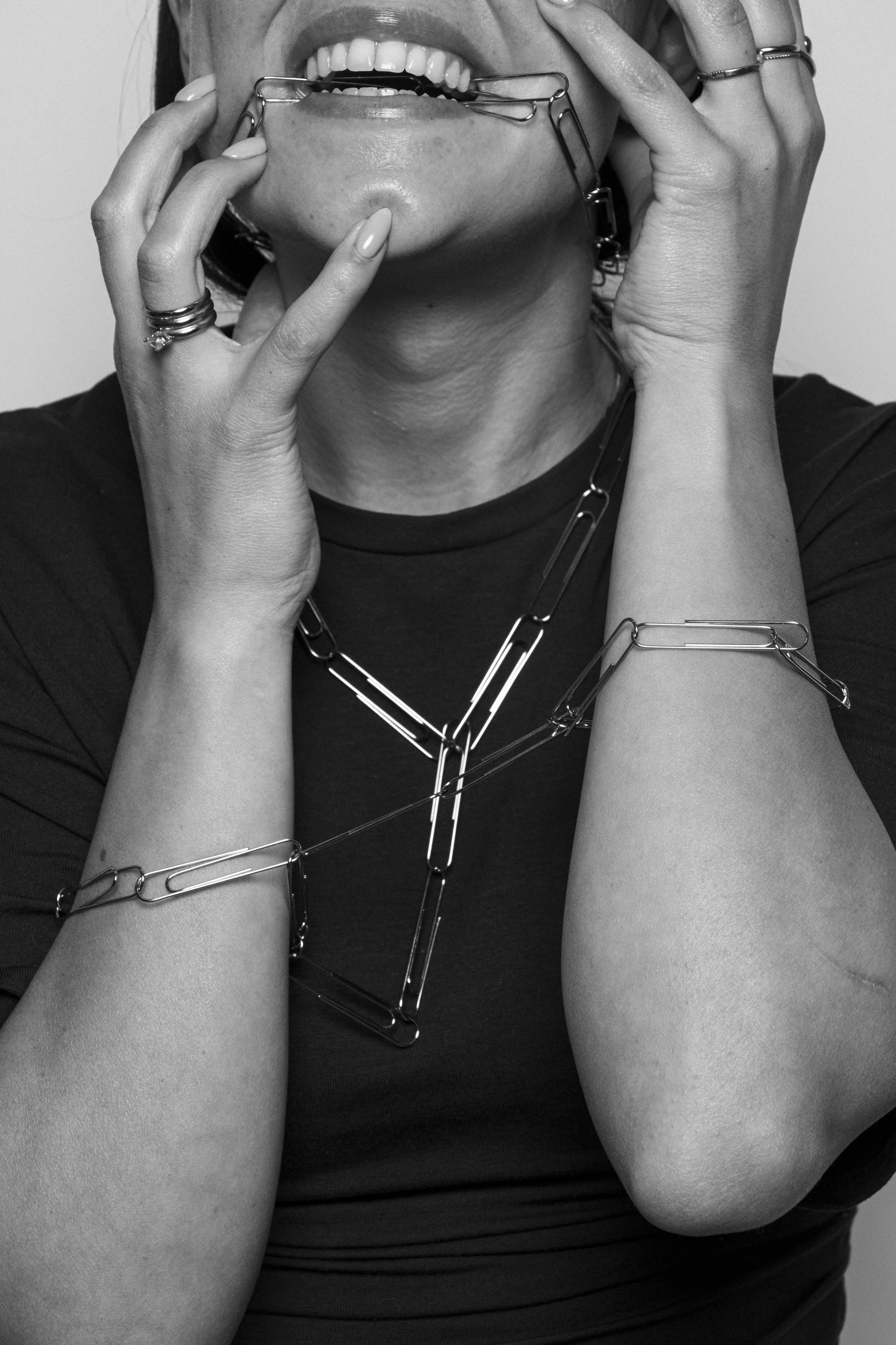 Ons eerste idee was om er oorbellen van te maken. Dat leek ons een leuke en opvallende manier om de paperclips te gebruiken. Maar toen we in de studio waren en het uitprobeerden met ons model, werkte het niet zoals we hadden gehoopt. Het kwam niet goed uit in beeld en het voelde een beetje leeg.