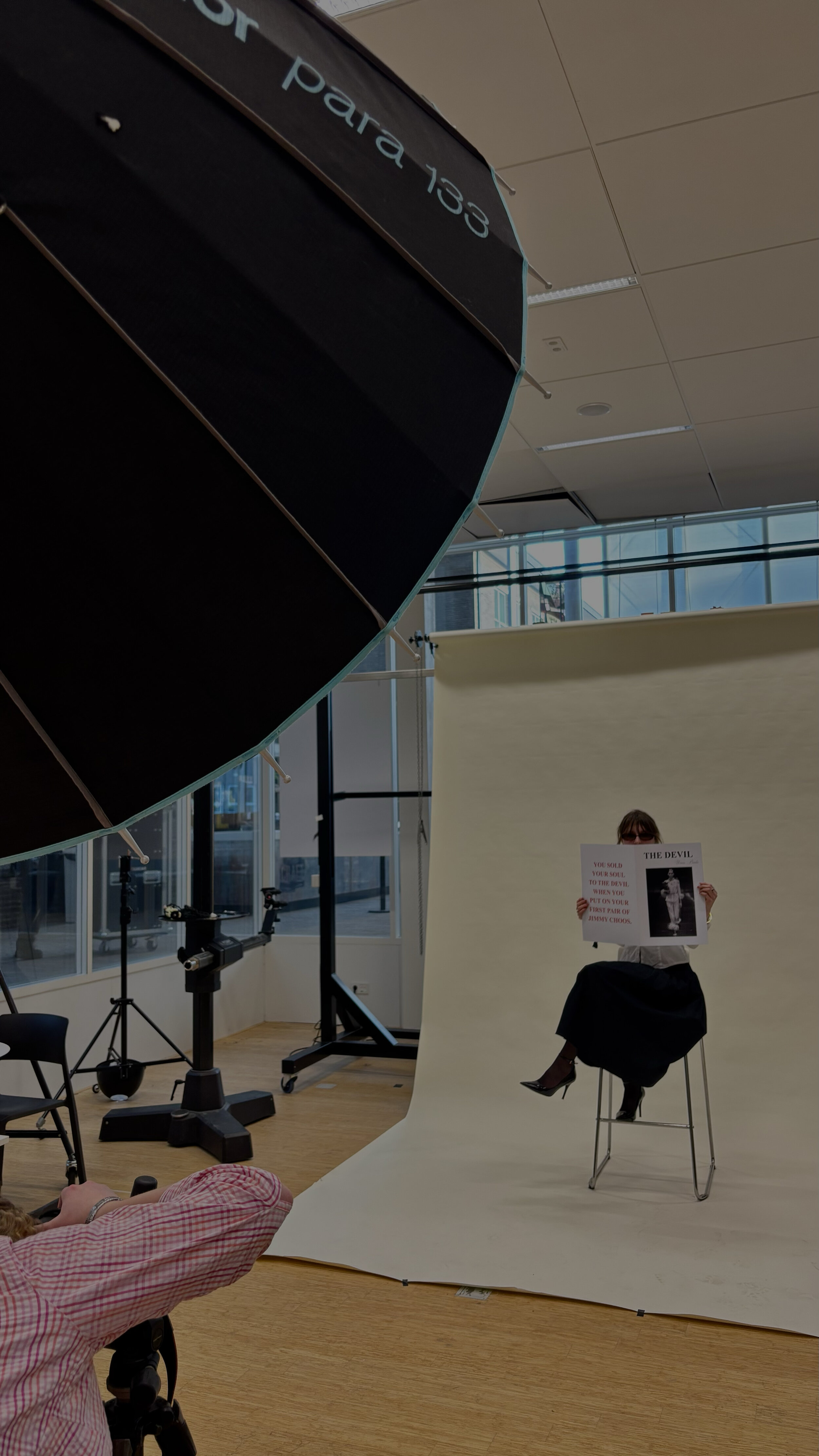 Om dit te realiseren, ontwierpen we zelf de voorkant van een fictieve krant die bij de film past. Ons model droeg kantoorachtige kleding, waardoor de professionele, stijlvolle sfeer goed naar voren kwam. Door de combinatie van styling, props en setting hebben we geprobeerd de herkenbare wereld van de film visueel tot leven te brengen.